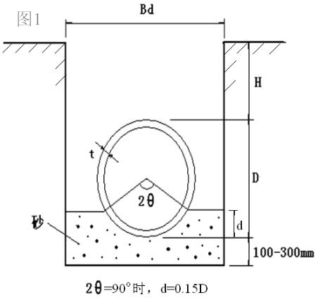 玻璃鋼地埋儲罐就位,應(yīng)注意基礎(chǔ)鑿平,檢驗平整度。罐體土弧基礎(chǔ)支撐角不小于90°,罐體土弧基礎(chǔ)支撐范圍內(nèi)罐體腋角部位要采用細沙或中砂填充密實,與罐壁緊密接觸,不得用土或其他材料填充。地埋儲罐頂部回填沙同基礎(chǔ)做法。(例如100立方:D=3100mm,d=500mm,Bd=5000mm(T型開挖,適當(dāng)放坡,底部寬度不得小于4000mm),H=覆土深度,根據(jù)現(xiàn)場實際情況。