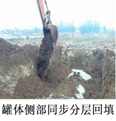 設(shè)備就位后平穩(wěn)放置罐體,回填土方應(yīng)采取先回填罐體腋角夾角及罐體四周兩側(cè)穩(wěn)定夯實,土方穩(wěn)定罐體后注水保平穩(wěn)沉降。回填土方要進行篩選無尖角石塊及建筑垃圾。土方回填杜絕鉤機、鏟車高空拋擲土方渣土從罐體上部重力沖擊回填,罐體注水應(yīng)與分層回填夯實土方同步,且灌水注入口不得單獨從罐體進水口、出水口或清掏口單獨注水,應(yīng)從兩處清掏孔同步進水,保證地埋儲罐內(nèi)部進水水壓平衡。灌水沉降后按圖紙標(biāo)高連接外網(wǎng)管道并保證密封處理,灌水量分時段注入,總水量不低于設(shè)備容積的2/3以保障罐體與承重地基平穩(wěn)沉降。在雨季施工時,要有排水措施,防止基坑積水及邊坡坍塌,同時將罐體內(nèi)注水防止漂移而造成位移。