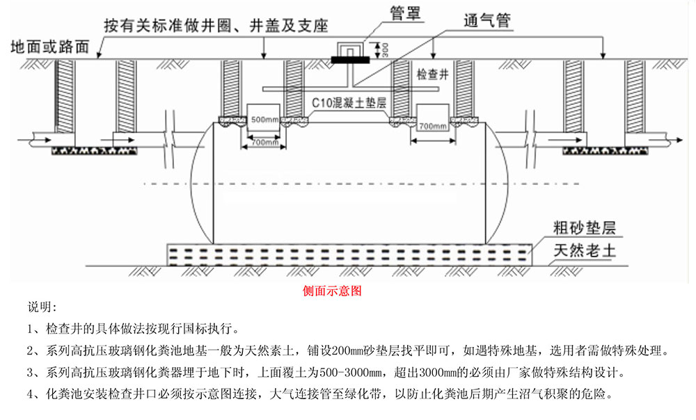 1、地埋儲罐檢查井口施工要連接通氣管,通氣管應(yīng)設(shè)管罩。通氣管施工參照示意圖二,通氣管引至綠化帶或與大樓雨水通氣管連通,以防止地埋儲罐罐體內(nèi)后期產(chǎn)生沼氣積聚及大市政排水時產(chǎn)生虹吸負壓吸癟或損傷罐體的危險。
