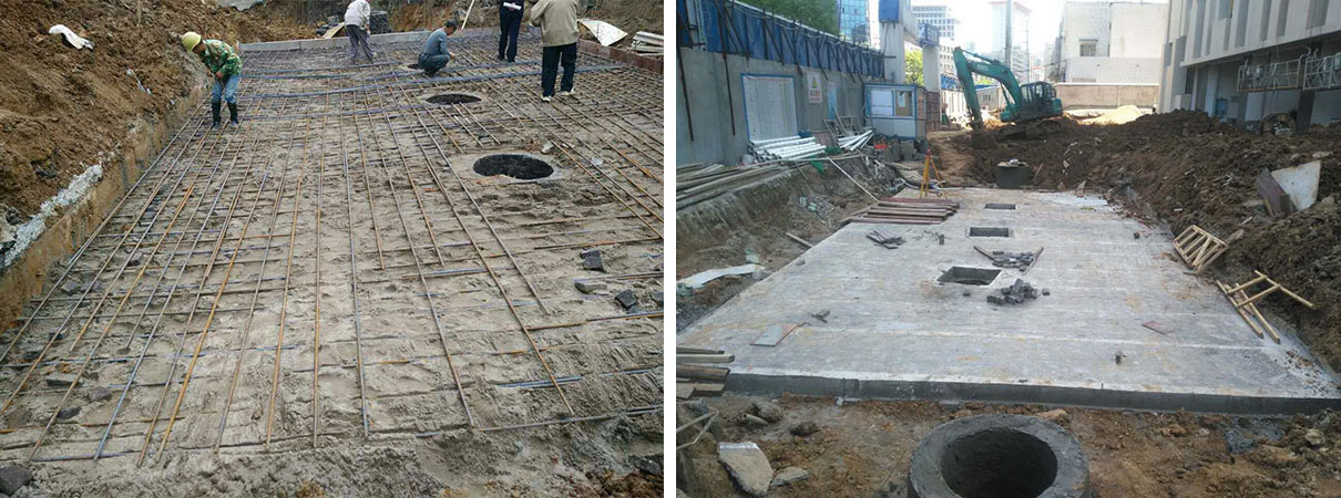 用戶根據(jù)工程設(shè)計圖紙中地埋儲罐安裝位置,安裝標(biāo)高和連接井位置進行放線開挖基槽,開挖基槽時,如有地下水,且地下水位較高時,可采用井點降水或挖集水坑直排,玻璃鋼罐體要設(shè)置在堅實,均勻的地基上,設(shè)備四周各需放寬600mm以上(不含土方放坡),并盡量保證干槽施工。基坑深度與罐體進出水管道標(biāo)高應(yīng)考慮設(shè)備注水后的自然沉降。