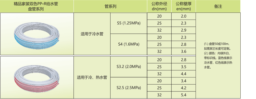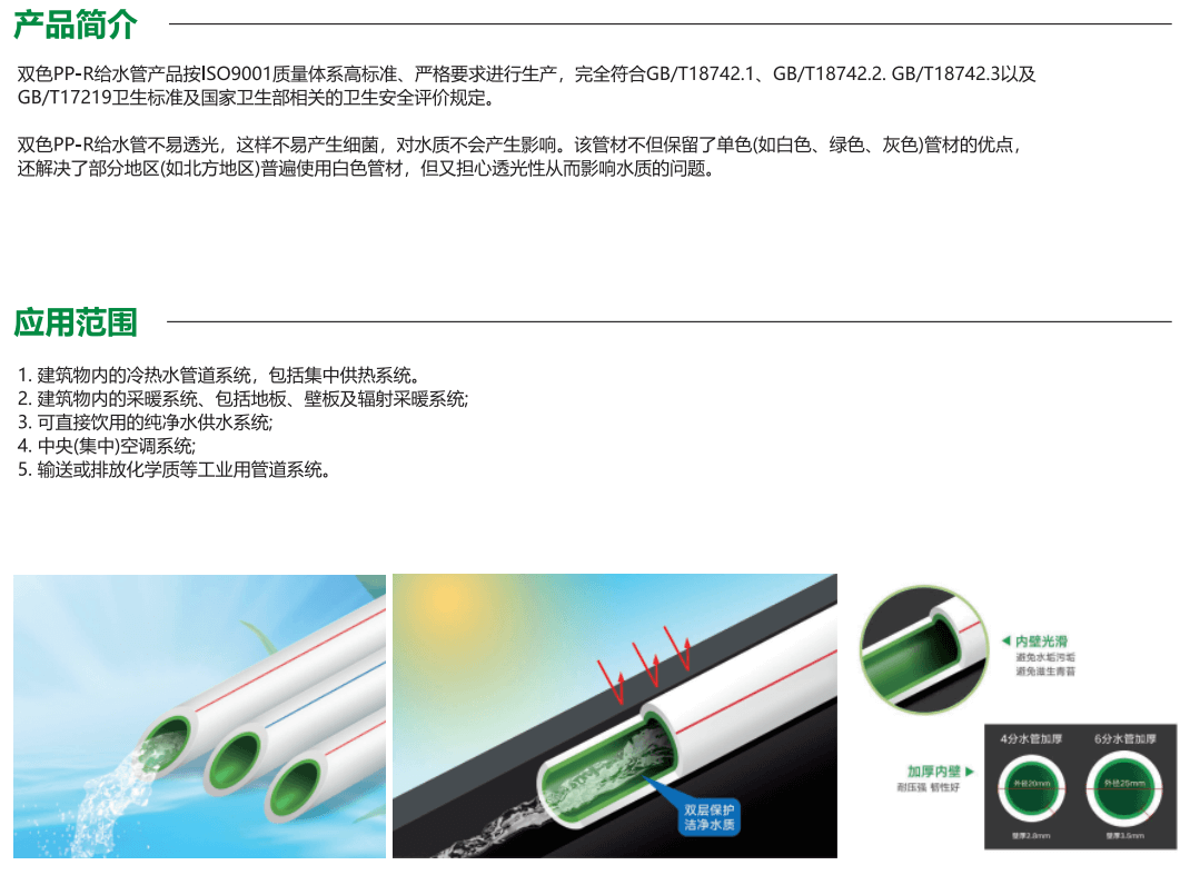 雙色PP-R給水管主要用于家庭的冷熱水管道系統(tǒng)和直接飲用的純凈水供水系統(tǒng)。因為管道采用雙層雙色的結(jié)構(gòu)不易透光,不容易滋生細菌,能夠保證水質(zhì)的清潔健康,